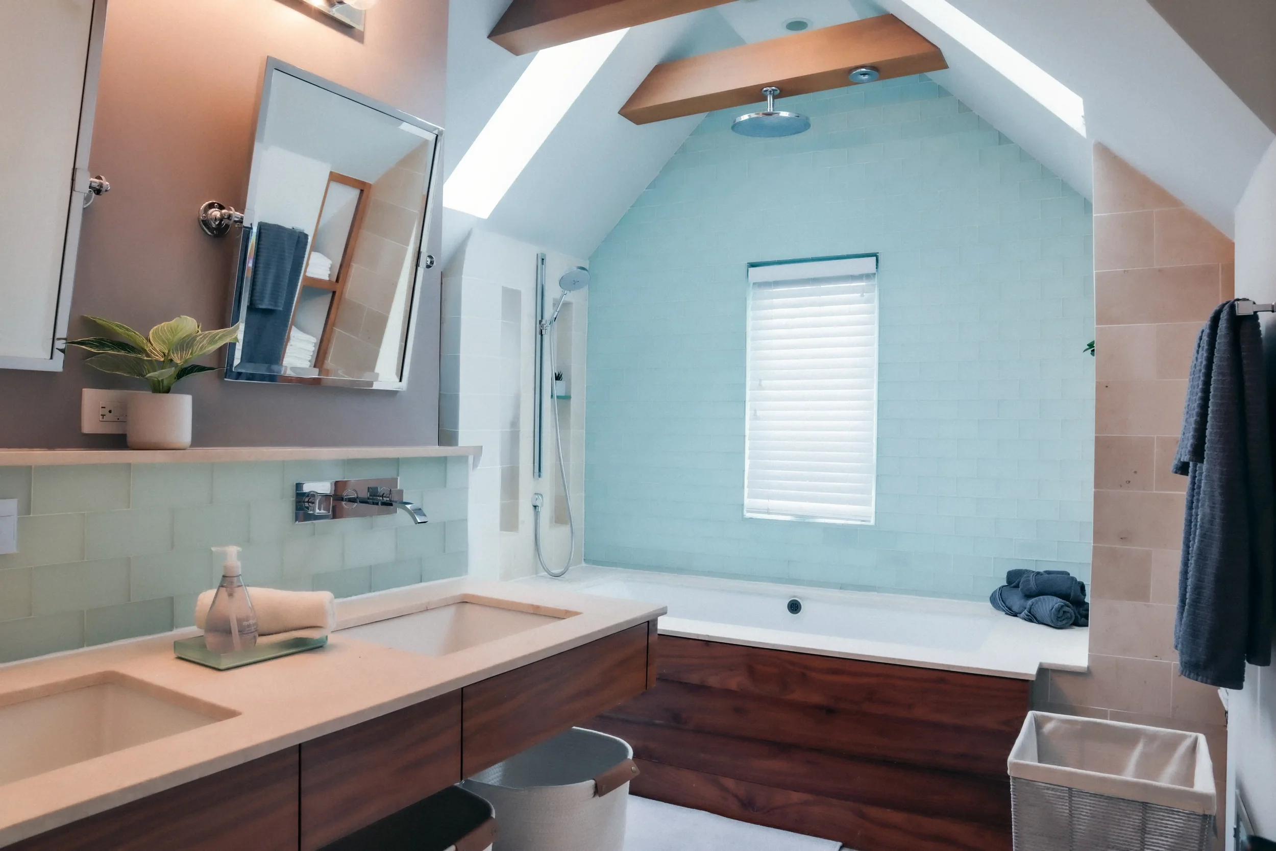 ✓ The layout was expanded by reclaiming unused roofline space, creating symmetry beneath the gable and room for a freestanding tub under natural light doubling the size of the bath and creating a cathedral ceiling!