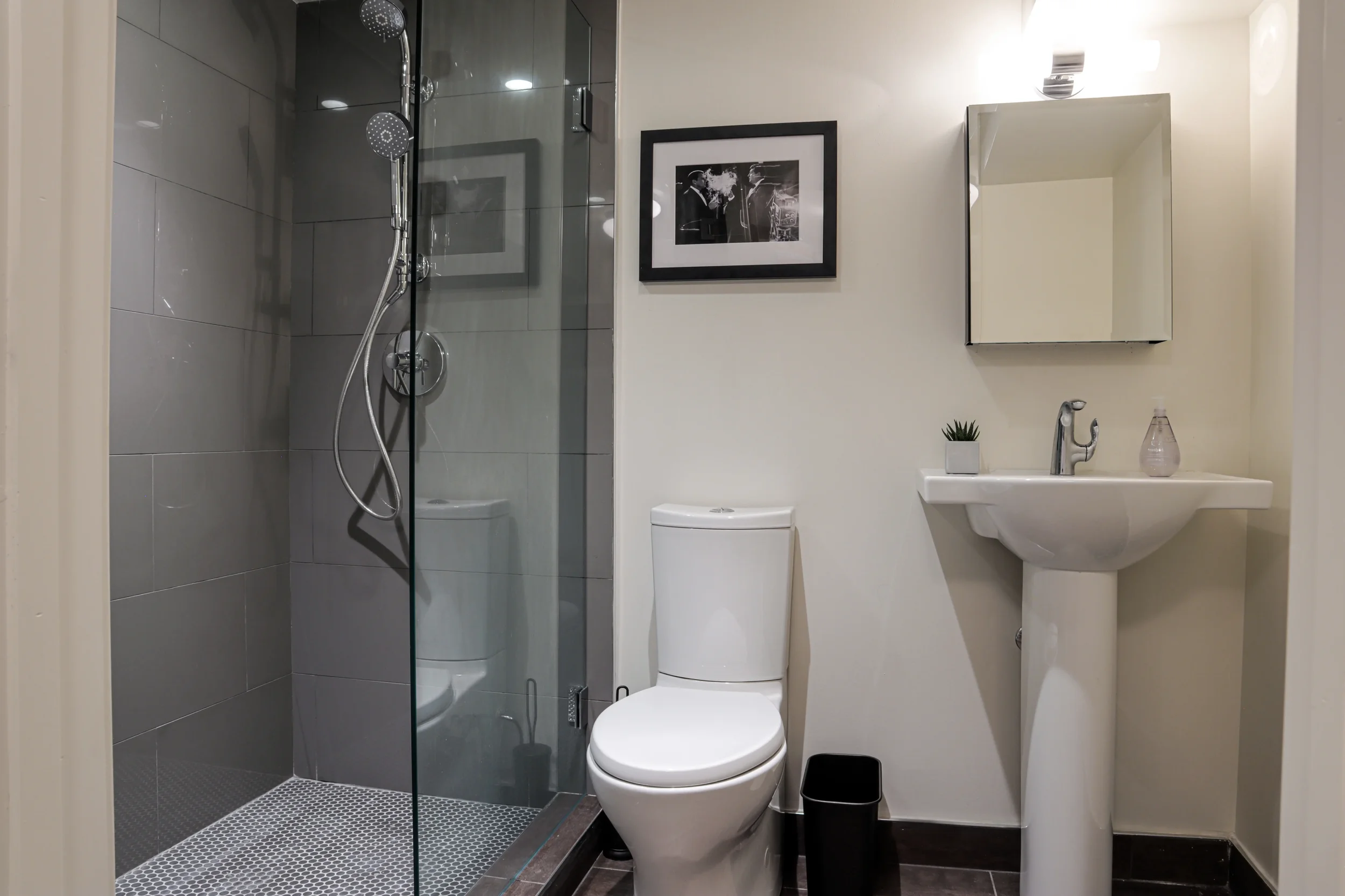 ✓ Sconces, mirror, and faucet elevate the space, while a pedestal sink nods to the home’s original 1930s character - a perfect blend of vintage charm and modern refinement.